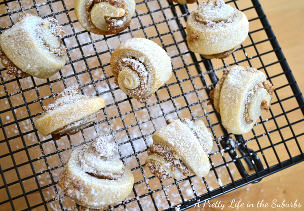 Then take each dough crescent, generously dust it with powdered sugar, and place on a cookie sheet. Space them about 1 1/2 inches apart. Bake in a preheated 350 degree oven for 14-18 minutes, until the tops start turning golden brown. Immediately remove them from the pan, and place them on a cooling rack. Generously dust them with powdered sugar again. Repeat all the above steps for the second disc of dough and the remaining filling.